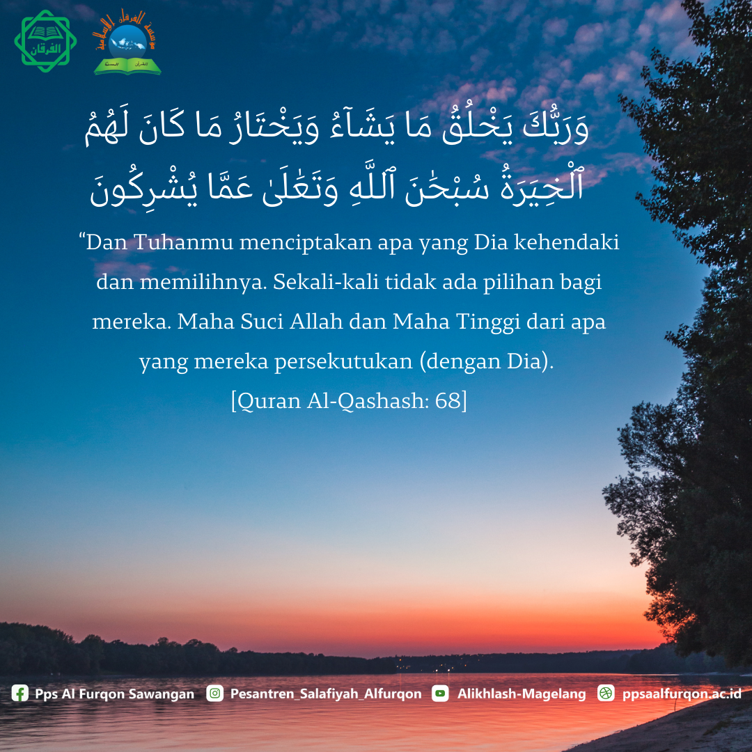 “Dan Rabbmu menciptakan apa yang Dia kehendaki dan memilihnya (untuk tujuan tertentu); mereka tidak memiliki pilihan. Mahasuci Allah dan Mahatinggi Dia dari apa yang mereka persekutukan.” (QS. Al-Qashash: 68)